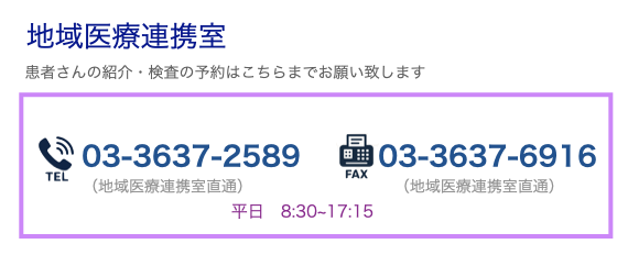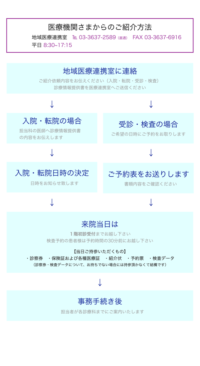 ご紹介やご相談、ご意見などがございましたら、どうぞお気軽に地域医療連携室(TEL:03-3637-2589,FAX:03-3637-6916)までお問合せください。