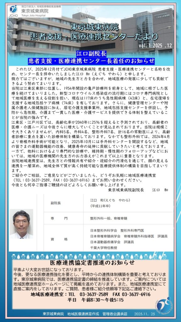 このたび、2025年12月付でJCHO東京城東病院 患者支援・医療連携センターと名称を改め、センター長を拝命いたしました、江口 和(えぐち やわら)と申します。微力ではございますが、地域の先生方と力を合わせ、地域医療の発展に少しでも貢献できるように努めてまいります。